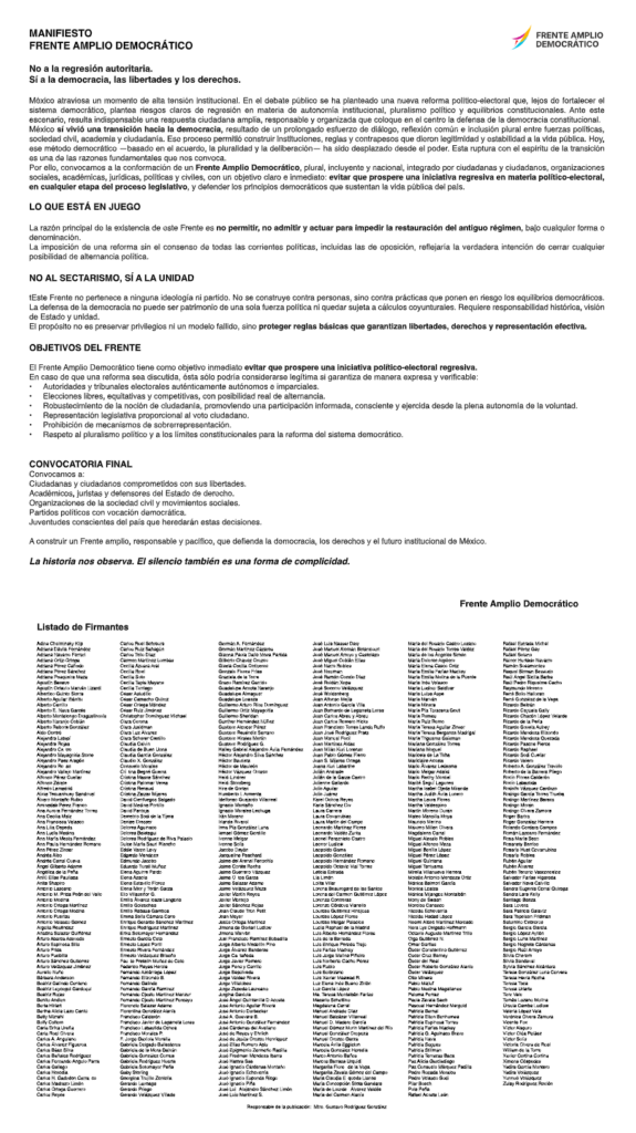 Ciudadanos, académicos, movimientos sociales y partidos políticos fueron convocados a unirse al Frente Amplio Democrático, ante un riesgo de regresión por la Reforma Electoral que se pretende efectuar en México.